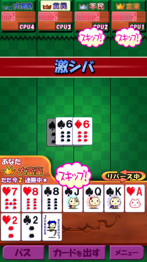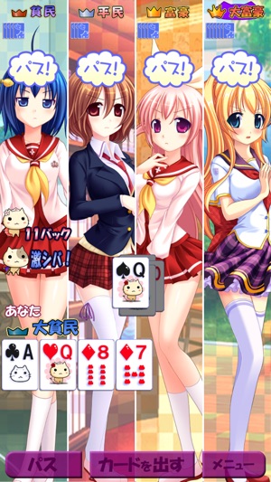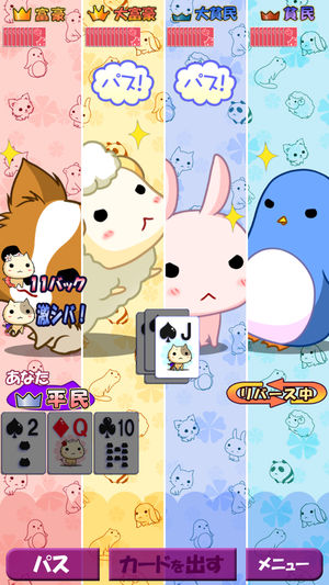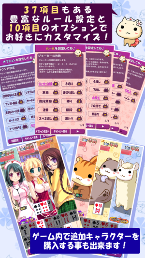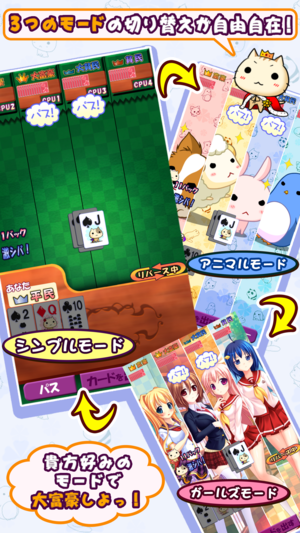 「大富豪しよっ!」はトランプゲーム大富豪が楽しめるアプリの決定版です!! ・iOS11に対応しました。(iOS9以上対応) ・地方ルールなどの設定は47項目! ・対戦キャラはSwanの美少女キャラ9人と、 かわいい動物キャラ9匹から選べます! ・キャラクターがダメな方でも気兼ねなく出来る 「シンプル画面モード」もあります。 ・そして、完全描き下しの新キャラクターを 購入出来るようになりました! ※購入後は最大15人+15匹のキャラで遊べる様になります ※キャラクター選択画面から購入頂けます。 【 ゲームの特徴 】 ◯ルール37項目+オプション10項目もある、豊富なルール設定!! ル…