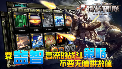 策略军事卡牌《新特种部队》-SpecialForces 《新特种部队》是一款以现代反恐战争为背景的军事策略卡牌游戏,展现了以中俄美为主导的大国集团与极端恐怖组织对抗的故事。游戏中,玩家将扮演一名反恐指挥官,收集卡牌组成最强阵容,迎接各种挑战。 以现代战争为题材,面向广大军事爱好者,五大阵营、海陆空三体展现大国军事力量。 经典纯卡牌玩法: TCG策略玩法,经典万智牌游戏机制,融合游戏王的战斗后带来更加深度的内容; 小数值展现超强竞技策略: 更清晰的展现战场局势,方便玩家把控战局,从而让战斗充满策略和变数 组牌策略: 不同卡牌间的技能组合带来无限的组牌空间,根据个人的策略喜好组成与众不同的最佳战队,快攻还是控场,随心打造 出牌策略: 根据场上形势,选择合适的卡牌进入战斗,往往关系到整个战局的胜负 巅峰对决: 跨服务器竞技战斗,五分钟一场策略对决,超神之路竞技体验更畅快