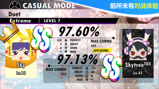 **荣获2016年度香港资讯及通讯科技奖 1.最佳数码娱乐大奖 2.最佳数码娱乐(娱乐软件)金奖 3.最佳数码娱乐(娱乐软件)特别嘉许(音乐及音效) ,三大奖项的殊荣。 全球20多位才华洋溢音乐家合力打造, 震撼人心的动人乐章, 前所未有的对战体验 - 首款在手机及平板上的实时对战音乐游戏 - 多变的音乐风格, 包括J-pop, trance, R&B, Hardcore, Jazz 等等 - 每星期由官方举办比赛, 考验玩家之间的技术 - 华丽的美术风格, 强烈感受歌曲气氛 两大游戏模式 - 「休闲模式」为正常游戏模式,玩家在选择歌曲后,系统会搜索其他选择了相同歌曲、难度的玩家一起进入对战模式,搜寻过程中玩家也可以跳过搜寻直接进行单人游戏。 - 「竞技模式」则为活动类型的模式,官方会以每星期为单位更新活动内容,玩家只要缴付金币购买入场券便可以参加。在竞技模式中,玩家会在随机歌曲中与其他玩家进行比赛,胜利场数愈多,奖品愈丰富!