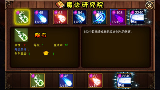 【产品简介】 一款魔幻题材横版无锁定技能战斗塔防过关游戏。 【游戏攻略】 1、角色等级提升后,可以开启更多的技能、更多的战役关卡、更高的强化等级、更高的技能等级、更高的魔法塔等级; 2、角色经验、金币的主要来源是战役关卡;魔法水的主要来源是魔法收集塔,不要忘记随时收集魔法水;如果金币、魔法水不足,也可以在神秘商店中购买; 3、强化角色的生命、攻击,提升技能等级,积攒足够的魔法水,可以帮助你通过更高更难的关卡; 4、完成关卡时,角色剩余的生命越高、最高连击与击杀怪物的比值越高,则关卡星级评价越高;星级评价越高,关卡奖励就越高。 5、每隔一段时间,将有几率出现魔法盗贼,会偷取魔法塔中生产的魔法水,不要忘记及时的将他击杀; 6、属性有相克关系,冰克火、火克雷、雷克冰;利用好相克关系,会有额外的攻击加成,否则会有减免;例如,使用冰属性的技能攻击火属性的怪物,将有额外的攻击加成,相反,使用火属性技能攻击冰属性怪物,伤害会减弱;属性相同、或对于无属性,则攻击既不加强也不减弱; 7、合成得到的技能,同一时间只能保留一个;只有基础的属性技能可以用于合成;合成时,合成技能的等级,将由2个基础技能的等级决定,在2个技能的等级范围内随机; 8、神怒技能不消耗魔法水,但在一场战斗中,必须消耗够一定数量的魔法水后,才可以使用神怒技能;