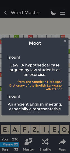 Advantages of the Pro version: **Ad-Free Experience** **7 additional board layouts** **Randomize the board. Mix up the DL, DW, TL TW tiles and give the game a new twist** **Option to enable the hints feature (Valid words appear above the rack as you form them by moving the tiles)** Word Master is a…