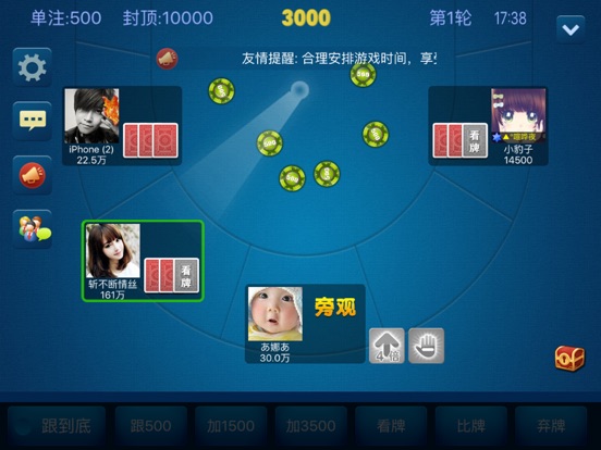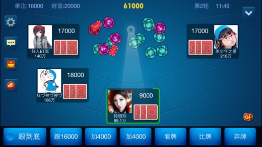 赢三张是惊险刺激的炸金花游戏,刺激的心理战让人流连忘返,赢三张又名炸金花,诈金花。包含标准的炸金花规则玩法和欢乐刺激的欢乐场玩法,豹子,同花顺,来比比谁的牌大!
