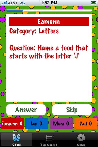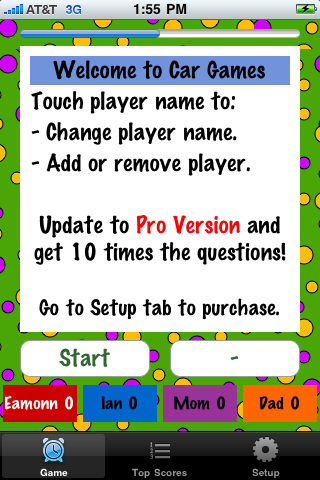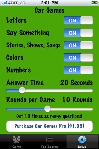 In-car entertainment for ages 6 and up. Players compete answering questions from the following categories: Letters; Say Something; Stories, Shows, Songs; Colors, Numbers. Change the time limit for your surroundings. Choose your categories, number of rounds in the game, and time to answer. Great sound effects as well. Upgrade to the Pro version to receive 10 times the questions.