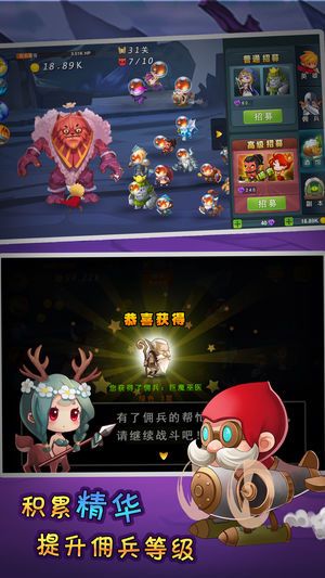 游戏描述: 5亿拇指的刀塔战争一触即发,经典英雄群殴震撼上线! 在这个英雄辈出,魔法纵横的奇幻国度,超过30位可招募的萌化Dota英雄供您雇佣! 迷茫时,冰妞为您指点迷津! 无助时,白虎宙斯为您解忧! 失落时,技能升级,英雄招募,让您重整旗鼓,大杀四方! 轮番变换的经典场景里,无数的BOSS等您挑战! 意气风发的刀光剑影中,神级技能随意触发! 您所要做的只是!点!点!!点!!! 游戏特色: 雇佣超过30位Dota英雄 击杀超过 60位经典BOSS 挑战超过 30个惊险副本 收集金币提升英雄等级 积累精华提升佣兵等级 寻找灵魂石进化佣兵品质 收集宝物强大你的佣兵