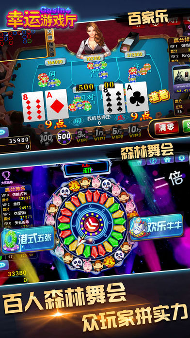 幸运游戏厅-最好玩的电玩城、街机游戏合集,全民赢大奖 《幸运游戏厅》是一款街机老虎机电玩城游戏合集,内置各种老虎机、水果机、森林舞会、水浒传、西游记、七龙争霸等大家熟悉的电玩街机游戏,每日登录游戏免费筹码任意领取。上手快,娱乐性强,玩法简单,中奖率高,紧张刺激的游戏过程中,可充分的体验到最流行的街机电玩城魅力!欢乐斗牛、炸金花、梭哈三种牌类玩法,万人同时真人连线,快速配座,轮流做庄,令你游戏妙趣横生! 【特色一:多种老虎机水果机,街机电玩城明星大合集】 《幸运游戏厅》将水果机老虎机电玩城等多种明星街机游戏全部整合,把这些好玩、刺激的热门街机100%完美移植,不同玩法,爽快非常! 【特色二:无需充值即可开心玩,登录即送海量筹码】 《幸运游戏厅》无需注册即可进入,进入立即领取免费筹码,无需充值即可体验电玩城的乐趣,每天整点还有筹码送,让你来的开心,玩的舒心! 【特色三:Big Win、小玛丽,森林舞会水浒传惊喜暴富乐趣】 各种游戏均有特殊“Big Win”设计,下注金额高倍偿还。进入多连线、全盘赢等模式立即开启Big Win!新加入的森林舞会、水浒传、西游记游戏带领你入无敌赚钱模式! 【特色四:真人在线同场娱乐,自动配座轮换做庄】 《幸运游戏厅》支持真人在线同场娱乐,自动配座轮流做庄,玩家和玩家直接直面博弈:欢乐牛牛、炸金花、梭哈港式一应俱全,让你体验成为赌神的快感! =====游艺机介绍===== 老虎机、水果机系列: ***七龙争霸*** 高投资,高回报。酷炫243条能够让你一键暴富。 七龙每一种都让您惊喜无限! ***明星97水果机*** 三轴七线高赢率,游戏彩蛋不间断。 分分钟让你穿起貂皮大氅。 ***水浒传老虎机*** 九线连财路,对连奖不断; 玛丽时时有,全盘霸江山。 ***西游记老虎机*** 四大名著再经典,师徒四人取经忙 齐天大圣可百搭,三桃进入免费场 扑克牌竞技系列: ***欢乐牛牛*** 简单的操作;快速的对局。 闲家倍率调整,用计算和技术征服全场。 ***炸金花*** 决胜负,泯恩仇 不成仁,变成鬼 流畅的节奏,胆识的挑战。 博一博,对子变豹子,输与赢就在一瞬间。 ***港式梭哈*** 公平竞争,进入游戏自动配桌。 三分运气,七分实力,私人包厢,尊贵独享。 ---------------------------------------------------------------- 【联系我们】 如果您喜欢我们的游戏,欢迎随时给我们留言、评论。 客服QQ:848673409 客服电话:4006689672