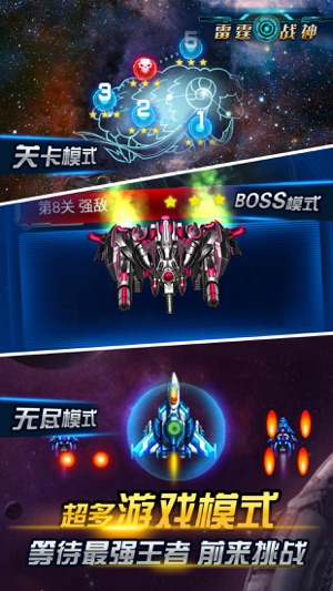 雷霆战神,弹幕射击类游戏良心巨制,在传承了经典弹幕类游戏丰富多样的弹幕同时,更引入了丰富有趣的养成系统,创新的游戏玩法,让你感受不一样的打飞机快感! 特色: 1.良心游戏,不花钱照样强大。 2.炫酷战机,花样弹幕,让你目不暇接。 3.装备升级、进阶,感受不一样的养成。 4.改造战机,发现你的无限潜能。 5.每日福利,感受成长的乐趣。