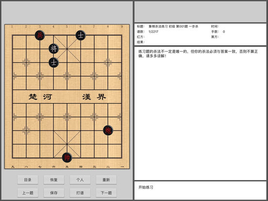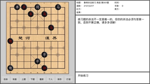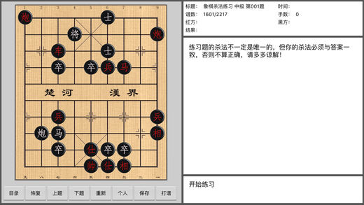象棋杀法练习提供免费版,欢迎下载。 象棋杀法是棋手对弈过程中的基本功,是象棋高级技战术的基础。它包含着对弈者的智慧,体现出无穷的艺术魅力,更包含着象棋攻防的规律。 象棋杀法练习共收入了各类杀法计2217道练习题,分为初级、中级和高级,初级为一步杀到四步杀的1600道题,中级536道题,高级81道题。如果坚持把这些题全部做完,杀棋能力将明显提高,用棋界 的行话来说,差不多可提高一马的功力,甚至更多。
