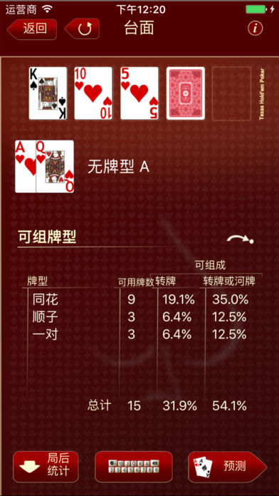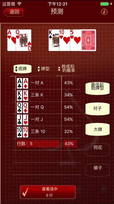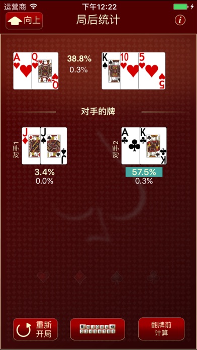 *** 过去谈的评论本身。看看他们 *** 扑克胜率计算器是一款强大而有效的德州扑克胜率的应用,在同类的应用中名列前茅。 本款应用的特色有: # 操作简单,使用方便 # 备有具有针对性的详细说明 # 算法独到,计算迅速 # 界面美观,图像精美 # 完美支持中文 在我们的Facebook主页上观看我们的视频演示和截图: https://www.facebook.com/PokerOddsCalculatorForIphone 支持多国语言。 ***************** An excellent tool and from what I can see the only poker odds calculator you will need on your iPhone. [...] Excellent graphics and speed as well. Product is reliable and professionally designed. Pokercalculatorreport.com Top resource for rating poker odds calculators ***************** 独家优势: 选牌方便快捷:秘诀1:轻滑指尖在钢琴式的键盘上选择您需要的牌面。 底牌胜率计算:将您的底牌与多家线上扑克网站数百万的牌局的结果进行分析,准确得出当前情况下(玩家数、当前位置、底牌)的胜率,是传统胜率算法的发展与完善。 在翻牌和转牌时计算组牌可用牌数(Outs数):计算组牌可用牌数在德州扑克中至关重要,然而有时计算起来确非常麻烦。此款应用将帮助您迅速准确的计算出答案。 对1到9位玩家时的胜率:杰出优秀的功能,通过后台随机模拟演算评估您底牌的胜率,在几秒内就能算出结果并以百分比或者比例的形式显示。 对特定牌组的胜率计算:这是一种全新的、独家的功能。软件将计算出台面上对手手中可能的牌型(30到70组),并在几秒内算出您的牌对他们的胜率。您还能根据不同的类别进行分类比较,例如针对同花或者顺子。 对1到7组底牌的胜率计算:在牌局结束,当您知道对手的底牌后,您可以重新计算在翻牌前/翻牌后的胜率。操作非常简单,使用方便。 祝您好运!