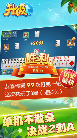 ------经典免费 扑克游戏------ 全民特色经典游戏“升级”上线了,多乐够级、多乐保皇团队精品续作。 升级游戏,又叫做双升、双扣、拖拉机或80分(八十分)。升级单机版免费下载、无需注册、安装后即可立即游戏,无需担心人手不够,一人也能畅快打双升。 --------升级单机版游戏特色-------- 【界面精美】 多乐团队专门打造的升级游戏iphone版,为手机&平板特意适配,带给您优质的视觉体验。 【操作简单】 升级游戏单机智能选牌,一指选牌,简单便捷,玩升级就是这么轻松。 【单机战绩】 谁说一个人打升级无聊?打完一轮战绩记录,胜负局数挑战不断,乐趣媲美升级真人版。 【 经典重现…