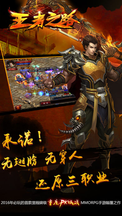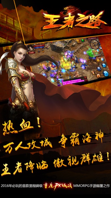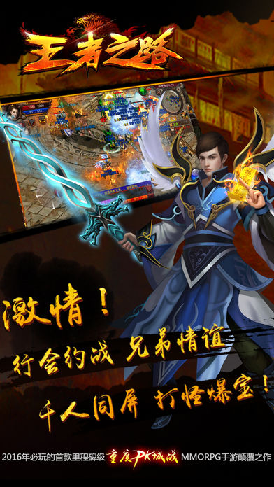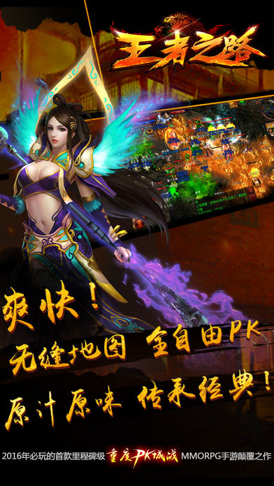 《王者之路》2016年最经典的PK+城战MMORPG手游。 拥有高度自由的游戏模式,精致细腻的游戏画质,完美重现无穿人PK,独创指向技能操作。不管是小规模行会战,还是激情澎湃的大规模万人攻城战,都淋漓尽致的还原和再塑了PK类端游的战斗乐趣,是曾经的热血玩家和PK类游戏爱好者不容错过的一款手游大作! 职业介绍: 战士:强壮勇猛,拥有坚韧潇洒凝重的气质,以防御和冲击能力为主。 法师:身单影薄,拥有远古掌握天地五行法师特有的气质,优秀的群体和远程攻击能力。 道士:神秘莫测,拥有掌握生命万物道法自然的神秘气质,以群体施毒为主,可召唤强大召唤兽帮助攻击。 核心特色: 1,经典! 纯正PK 1.76 王者回归 2,承诺! 无翅膀 无穿人 还原三职业! 3,热血! 万人攻城 争霸洛神 王者降临 傲视群雄! 4,激情! 行会约战 兄弟情谊 千人同屏 打怪爆宝! 5,爽快! 无缝地图 全自由PK 原汁原味 传承经典!