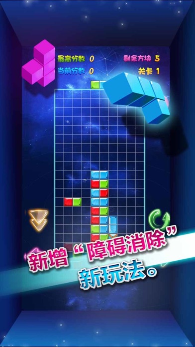 多牛百变方块绝对是一款不容错过的方块世界休闲小游戏!新增的六边形消除frvr和障碍消除玩法,虽说是去除了横竖消除的限制,但是比传统方块世界的玩法更需要动脑动手!带你颠覆方块世界的认知,精彩方块大战等你来战,关注我们,更多玩法不断更新中…… 功能: +超级耐玩的方块世界 +自动储存游戏进度 +多款道具助你在你方块大战中无限徜徉 +不甘心方块大战辛苦战绩结束中断?复活功能满血补上 多牛百变方块世界六种玩法: 1、拖动模式:将屏幕下方的三个备选方块拖入宫格中,一行或一列铺满即可消除 2、下落模式:与俄罗斯方块的玩法相同,使用宫格旁边的四个键控制方块的下落,变换其形状以契合其他方块,使之整行消除。同时消除的行数越多,得分越高。 3、坠落方块:这个是俄罗斯方块的变形体,不同的是可使用块宫格旁边的左右键控制方块颜色,3个及以上相同颜色的方块叠在一起即可消除。方块累计26行时游戏结束。 4、消除模式:过关玩法,消除块宫格中,3个及以上相同颜色叠在一起的方块,达到目标分即可抵达下一关 5、六边形消除:新增的frvr玩法,打破了传统的俄罗斯方块消除方式,也是拖动模式的六边形消除增强版,上下左右,只要是整行都可消除 6、障碍消除:过关玩法,在剩余方块数用完之前消除所有捆绑的方块即可过关,使用1010方块宫格旁边的四个键控制俄罗斯方块的下落,四个相同颜色的方块叠在一起即可消除