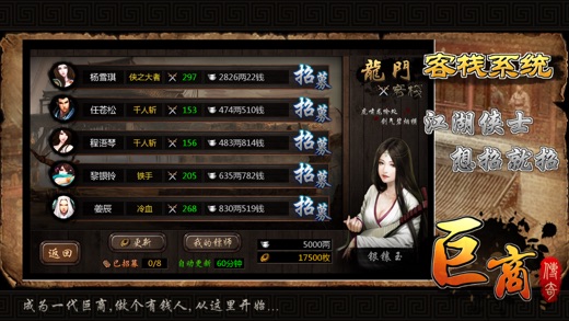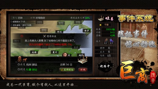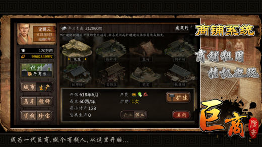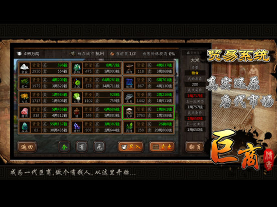 独特古代模拟经商手游新年首发! 唐朝是一个繁盛的朝代,你将扮演一名在唐朝的跑商的行脚商人,通过各种途径赚得银两从而慢慢成为一名富可敌国的巨商。 ●游戏中玩家需要考虑许多因素 ,如季节收成、灾祸或是国家的安定情况等,这些都会影响着物价的波动。 ●强大的物价模拟系统,不同地区都有着物产与物价差异,好好了解各地的区别与物价规律将对跑商非常有 帮助。 ●多种系统适合多种玩法: 跑商系统 - 奔波于各大城市间倒卖货物赚取差价,拥有上好的马匹是效率的保证。 镖师系统 - 跑商经常会碰到不怀好意的强盗,去[龙门客栈]雇佣一些镖师是非常不错的选择,击杀盗匪还 可能获得各种稀有珍宝,拿去卖掉可以获得不少银两。 商铺系统 - 租用商铺可以自动定期为你生产对应的货物送到货栈供你贸易之用,在你忙得不可开交之时租些店铺挂着机生产货物也是非常不错的选择。 环境系统 - 游戏中会模拟真实环境,根据时间推移会有四季变化和灾祸随机发生,还有如战乱等事件发 生,这些都会影响货物的价格和产出。 珍宝系统 - 珍宝是游戏中重要的收集元素,可以通过击杀盗匪或者偶尔碰到稀有商人购买获得,珍宝价值不菲,也具有各种特效辅助你获得更好的利益。 马车系统 - 马车是你跑商的基本,多购买些好的马匹可以是你更有效率。 成就系统 - 大量的成就与通宝奖励可以让你不用花钱也能畅玩游戏所有功能。 排行系统 - 6大排行榜可以让你全面与其他玩家进行角逐,看看谁才是巨商之王! ●更多的系统与玩法就在游戏中慢慢探索,或许会有不少惊喜。 这是一款轻松的游戏,同时这也是一款不轻松的游戏,玩法由你决定。 一起开始来“巨商”之旅,做个有钱人吧!