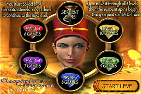 The Ancient Pyramids symbol is a scatter symbol, which will pay in ANY position on any line. The Eye of Ra symbol is a wildcard which substitutes for all symbols except scatters. Three or more Ancient Pyramid scatters appearing in any position on any reels starts Cleopatra's Treasure Feature. When the Feature starts, you are awarded 10 free games - the Yellow Jewel Games. During these 10 free games you need to collect 15 or more yellow jewels. If you collect the 15 jewels you automatically progress to the next level of the feature. During the Cleopatra's Jewel Feature, Cleopatra herself will appear in the game, substituting for all symbols except scattered pyramids. All winning paylines where Cleopatra appears are paid out at FIVE times normal pays. During the feature free games, the Pharaoh Tutankhamen expands to his full size sarchophagus on every reel. After any free game spin, if he is covering an entire reel his sarcophagus will open and reveal a magnificent bonus prize - free spins or even Pharaoh sized piles of free credits! If you make it all the way through to the Red Jewel Feature and save the 15 red jewels, you start the Serpent Spins! The Serpent Spins are five free games - all wins multiplied by five. The number of Cleopatra wildcards on the reels during these games is TEN times the number normally appearing. After any Serpent Spin free game where you don't have a win, you are awarded one additional free game. All Serpent Spins are guaranteed to win! In these games, the Asp is on your side - if he appears anywhere on the last reel, you win an additional free game! At the end of the Jewel Features, whether you win the Serpent Spins or not, the Eye of Ra Feature is awarded: The Eye of Ra Feature In the Eye of Ra Feature, all reels will fill with Snakes and Red Jewels only. The reels will spin once. After the spin, you have three seconds to memorize the locations of the red jewels. All reels will then be covered by the Eye of Ra. You must then tap on each Eye, finding the red jewels hidden beneath. If you find all red jewels without revealing a snake, your entire win is multiplied by the number of red jewels found. If you find a single snake hidden in the reels, you lose any additional bonuses and your feature is ended. This game is for entertainment purposes only. No real money can be won or lost. The odds of winning in this simulation are not the same as in real slot machines. Real slot machines are designed to make you consistently lose. You must be aged 18 (or 21 in some areas) to gamble. Pokie Magic supports responsible gambling and appropriate parental supervision.