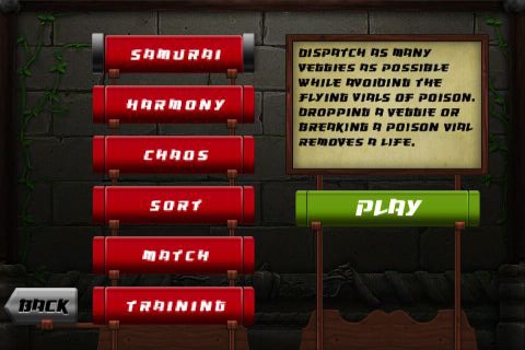 JOIN OVER 4 MILLION VEGGIE SAMURAI PLAYERS!! It's time to give veggies what they have had coming for years... Feel the power at your finger tips! Put your swordsman skills to the test as you use your fingers to slice and dice veggies of all shapes and sizes in Veggie Samurai. Veggie Samurai is an addictive, pickup-and-play action game that puts you in the heart of all-out veggie carnage. ****** 6 DISTINCT GAME MODES ****** --- Samurai Mode - 3 Lives. No time limit. Avoid dropping veggies. Avoid poison vials. --- Harmony Mode - Time based. No poison. No lives. More action. More combos. --- Chaos Mode - All Out veggie smack-down. 3x the pace. --- Sort Mode - Selective slicing. Only the chosen veggie shall pass. --- Match Mode - Frenzied action. Spot the matches. Slice combos. Use the Wild Pepper. HUGE combo sizes. --- Training Mode - Free play. No time limit. No hazards. ****** FEATURES ****** --- Slicing AND Dicing allows you to cut up veggies multiple times (some veggies can be diced a surprising number of times...) --- Watch your score skyrocket as you perform Slice Combos, Multi-Dice Combos, Dice Chains, Pea Killers, Onion Blossoms, and more! --- Score big bonus points with Rare MEGA VEGGIES that can be triggered by figuring out the secret, in-game prerequisites --- Keep your eyes peeled and score big points with the rare bonus veggies! --- Fight for global bragging rights atop the Open Feint Leaderboards --- 32 Achievements and counting… (as if dicing veggies to bits wasn’t enough) ****** IN DEVELOPMENT ****** - Open Feint - Game Feed integration Now go out and prove your worth as a VEGGIE SAMURAI… Veggie Samurai is in no way associated with Halfbrick Studios and/or the game Fruit Ninja.