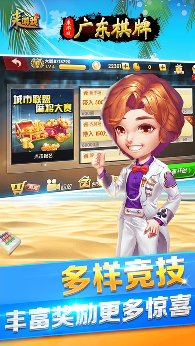 来游戏官方全新力作,引领棋牌手游新时代! =====游戏简介===== 广东麻将-来游戏,采用广东地区流行的麻将规则,特色玩法如买马、推倒胡带鬼等。灵活的玩法配合来游戏的3D界面,让人欲罢不能。 =====游戏特色===== 【包房】新增特色包房,灵活创建房间,邀请好友竞技一决高下 【回放】边录像边玩牌,牌局回放功能让你在回顾牌局的时候还能炫耀牌技 【比赛】更多赛事活动搭配精美礼品,用惊喜回馈用户 【角色】结合手游经典RPG,带着你的MM上牌桌,享受暴击快感 【宝箱】多样钥匙开启多种宝箱,欢乐多多惊喜不断 ====联系我们==== 微信公众号:laiyouxi 客服电话:4000051827 >>来游戏——Unity3D引擎打造的休闲竞技类游戏平台,给您身临其境的3D游戏体验<<