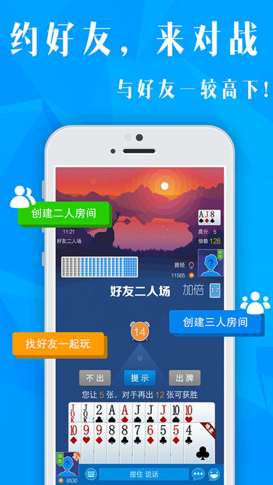 独“竖一帜” ,竖屏-单手操作! 唯我应用风,清爽-久战不乏! 好友随时约,高手-不再寂寞! 省流量,玩法多,经典、癞子、炸弹,一样不缺! 社交棋牌新玩法,打造史上最壕斗地主! 让玩家单手就能轻松享受竞技游戏快感!游戏多重精彩玩法完美呈现:最纯正的经典玩法,最刺激的百变癞子玩法,还有随时随地对战,零流量消耗的超炫单机玩法,都能让你乐享其中!
