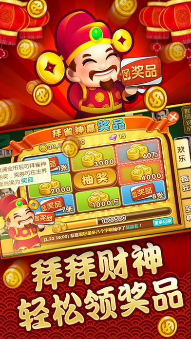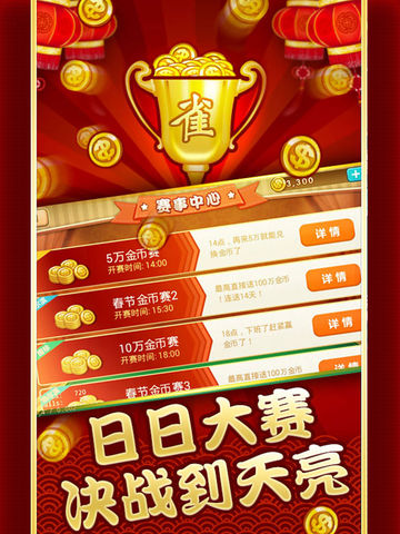 天天麻将包含国标玩法、二人麻将、四川麻将、血战到底、血流成河、哈尔滨麻将、中发白等多种玩法,麻将合集。同时支持不联网的单机模式! 天天麻将福利超多的比赛场,送话费、送购物卡、送电视、送冰箱!天天有比赛,时时有奖拿! 天天麻将还包含德州扑克、百人牛牛、水果机、炸金花等各种游戏,一个应用玩转多个棋牌游戏。 天天麻将还有拜雀神等特色玩法,轻轻松松赢话费。 天天麻将,麻将达人最爱,三缺一,就等你来。