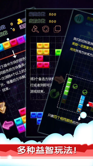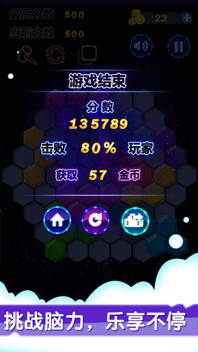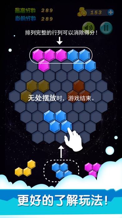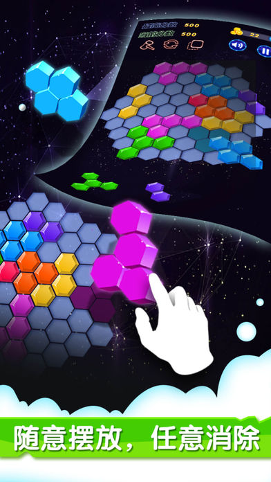 对于手残星人来说,竞速游戏和考验反应力游戏都显得自己笨手笨脚。而这款不拼手速不卡时间不计体力的六边形消除应运而生。它被誉为史上最有创意的游戏,动用你的最强大脑,简单粗暴的刷新最高分吧! 初识这款游戏,你是否有种似曾相识的感觉?它的模样,像极了童年的跳棋。但无论是内涵还是效果,六边形消除完败跳棋N条街!在兼顾经典的基础上,将方块升级为六边形,将消除模式演变的更加魔性。“看着空,放得下”是六边形消除游戏的硬道理。画面清新亮丽,效果精彩绝伦。不仅如此,还可以将游戏得分晒到朋友圈或微博,让你的小伙伴眼馋心热! 六边形消除玩法简介: 游戏主界面是一个大六边形棋盘,玩家拖动随机出现的六边形组合置于大六边形的空白处,创造并消除完整的一行或多行的线条,并通过连击消除来获得更高的分数。当棋盘上再也无法摆下任意一个六边形组合的时候,游戏就会GAME OVER。 六边形消除游戏摒弃了限制,开创了三个方向:横、左斜、右斜都可以消除的先例。没有时间限制,玩起来更自由,也更具挑战性。想要获取高分,就快快拿出你的无限钻研精神吧! - 动感音乐+3D特效,增添六边形消除的耐玩性 - 多款道具助你勇夺高分,趣味性翻一番 - 分享功能让你与小伙伴互晒得分,一起成为六边形达人! - 更多7种方块玩法,自由随性,等你来战