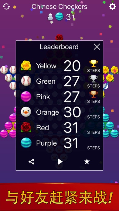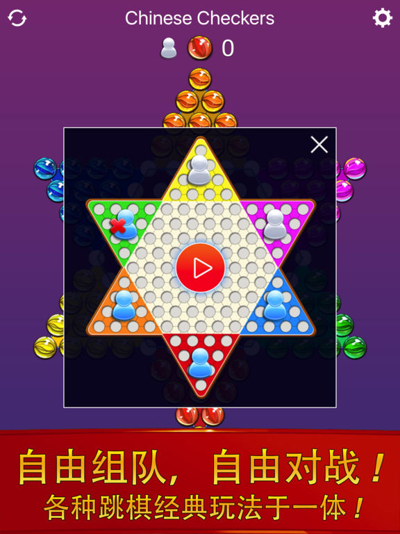 App Store最聪明的中国跳棋,全球超过100万次下载! 中国跳棋,简称跳棋(香港称为波子棋),是一种可以有二至六人同时进行的棋,棋盘为六星型,棋子分为六种颜色,每种颜色10或15枚棋子,每一位玩家占一个角,拥有一种颜色的棋子,有时人数少的时候,也可以用每人两种颜色的棋子一起玩。 中国跳棋的前身是正方跳棋,大约出现在维多利亚时代,最初的棋盘是正方形的,共有256格,开始时棋子分布在四个角落,以最快跳到对角为目标,规则和现在的中国跳棋类同。不久就有人改成星形棋盘, 称为Stern-Halma。三十年代起在美国开始流行,并改了Chinese Checkers的名字。当这种棋子传到中国时,因为改以玻璃弹珠作棋子,因此亦被称为波子棋(玻璃弹珠粤语称为“波子”)。 玩法 先将一种颜色的棋子全部放在一个角上,各人循顺时针或逆时针方向轮流走子,每次动一枚棋子,全部棋子先到达对角那一边的为赢家。棋子有两种走法: 1) 一枚棋子移动到相邻六格其中一格。 2) “搭桥”:自己的棋子(A)同一直线上有另一枚棋子(B),不限属于哪一方,大家之间没有任何棋子阻隔。如果B的另一方也没有棋子阻隔,A就可以跳到B的相反方向,而且和两枚棋子原来的距离一样。跳跃可以连续进行,直至跳无可跳为止。如果出现循环的话,可选其中一处停下。 游戏界面丰富,值得您与小伙伴们开心的玩耍!希望您喜欢我们的游戏!您的好评是对我们最大的鼓励!