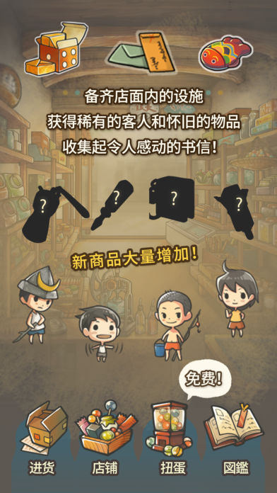 一个能够回味儿时的感觉,让人不禁眼角湿润的养成游戏。 感谢所有玩家的喜爱、令人期待的续篇终于推出! 这是一款经营一间令人怀念的小小杂货店的故事式轻松放置型手机游戏。 妥善的经营小店、让那些令人怀念的小玩具以及糖果都逐一登录到图鉴上! 「谜之酸酸甜甜的养乐多」「发光的骷髅」「酸梅」等等、 以前玩过这个!的感觉不断让人不禁微微一笑,怀念感满分的道具満载! 随着游戏的进行,故事也一点一点的向前推进。 令人为之感动的故事剧情逐渐的明朗、敬请各位将最后的大结局看完。 并且这次加入了全新禁忌的「转蛋(免费!)」系统。 那些几乎让人产生头晕的无聊小东西。但却是令人爱不释手。 与诈骗只是一线之隔的昭和杂货店小东西这次大量进货啰! 保证从头到尾都可以免费进行游戏,每天都请要记得推进一些些的进度唷。 对于日日忙碌而疲惫不堪的您,为您提供一个小小的疗愈时刻。 【剧情】 这里是三丁目的街角。时间是正当昭和的年代。 正要开办奥林匹克而活力十足的城镇。 在这样的东京的一角、有着一间小小的杂货店静静的耸立在那而。 一位温和的婆婆、独自一个人经营的一家小小的店面。 挑望着被夕阳照的通红的东京铁塔、婆婆总是会回忆着过去的每一天。 曾经幸福的那一天、难过的那一天、发生了很多事的日子、以及那一天。 来吧、就让我们和婆婆一起、回到那一天那一个时候感受那一种感觉吧。 夕阳的红云和屋台叫卖的声音。 打弹珠、玻璃球、纸气球。 糖果、醋酸海带、万花筒。 一切的一切都有如宝石一般珍贵的每一天。 虽然是个没有手机也没有网络的年代、但所有事物都绽放着光彩…。 曾真心希望永远也别结束,那夏天的某一天…。 这是一个、随处可以遇到的、随处可见的、一位「婆婆」的故事。 ◎玩法 【目的】 ・从客人那里获得金钱后可以让杂货店提升等级! ・图鉴将会逐渐的被那些令人怀念的道具给填满,目标是全部收齐,加油! ・然后欣赏故事的结局吧! ・利用转蛋的硬币来将转蛋的整个系列都收归己有吧! 【基本规则】 (1) 利用「进货」来增加商品 (2) 身上握着大把零用钱的小鬼们(客人们)就会不断的涌进来 (3) 用手指画过客人的身体来让他付钱! (4) 当金钱增加了之后就可以在「店铺」选单里选择强化店铺喔! (5) 当店铺被强化了以后就会出现新的「进货」的种类 (6) 利用新的「进货」就可以更容易招来新的客人 (7) 收集了各式各样大量的客人之后图鉴里面的道具也会跟着逐一出现! 不断的重复(1)到(4)的动作之后金钱赚取的速度就会逐渐提升。 就这样一路努力不懈的将图鉴全数收齐并且看完所有的剧情故事吧。 【关于日期】 在游戏之中、日期会从星期一到星期日为一个循环一直不断的变化。 每一天会出现的客人都会稍微有点不一样。 哪一个客人会在星期几出现的部分可以在「图鉴」选单里面进行确认。 星期几是依照时间变化会逐渐改变的、所以偶尔开启游戏确认一下日期吧。 另外、提醒您星期几并不是依据真实时间而变化的。 【回忆】 在店铺的里面有一间婆婆的房间、这里有时会出现「回忆」漂浮在空中的情况。 只要收集这个、故事就会慢慢的往前进。 所以请别忘了偶尔也要去客厅里面晃晃喔。 【转蛋】 一起来旋转扭蛋、收集那些无聊透顶的小玩意儿吧。 转蛋的转出物会依照星期几而有所不同喔。 虽然有时候也会转到一模一样东西的时候、不过请不要灰心! 转蛋并不是使用金钱而是使用专用的「转蛋的硬币」来进行的。 转蛋的硬币可以透过收集「回忆」、或是偶尔在其它各种地方获得喔。