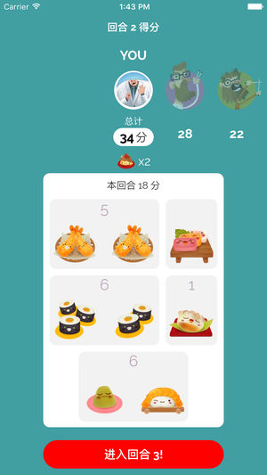 和朋友,家人一起在游玩Sushi Go!过程中享受轻松简单的快乐吧! 创建你自己的寿司搭配 在Sushi Go!中,玩家面对各式各样的寿司找出心目中的最佳组合。无论是收集数量最多的寿司卷或者搭配一组生鱼片来获得分数,还是将握寿司沾上芥末让分数加倍。最后别忘了给自己留点甜点要不然只能吃自己的分数啦!总之,争取获得最高的分数成为寿司大师吧! 特色 * Sushi Go官方游戏,和原版桌游一样的卡通画面 * 精美的游戏动画和人物 * 通用App - iPhone和iPad都能玩 * 挑战各类AI人物 * 和Game Center中的好友在线对战 * 25种以上成就等你来征服