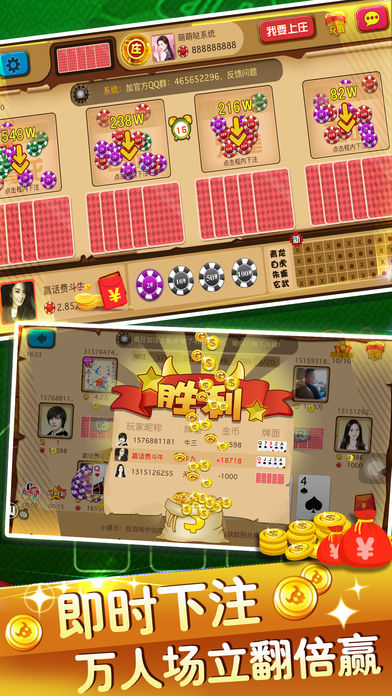 ------ 2017第四代全新 牛牛棋牌手游! ------ ---- 最新3D引擎,推出最强斗牛竞技时代! ---- 欢乐牛牛以轻松、快速的游戏体验强势来袭,带大小王共54张牌的设计,带来更丰富的牌型组合。先看牌再加倍的设置,给你最理性的加倍选择,百人牛牛热闹非凡,让你体验一夫当关万夫莫开的成就感,不可错过。天天玩游戏,金币送不停,快乐的欢乐牛牛手气旺,天天玩天天开心。 百人场里的快节奏让你目不暇接,激情四射。欢乐牛牛,在游戏中享受欢乐,在欢乐中寻找刺激,是外出旅行,居家娱乐的必备,绝对不要错过。温馨提示:合理安排工作和生活,适度游戏,享受生活。 ~~~~~~~全民最火斗牛竞技,国民级斗牛游戏特色~~~~~~~ 【游戏特色】 1.独创癞子玩法:大小王做癞,牌型更丰富,游戏更刺激。 2.快拼激情四射:算牌更快捷,比牌更有底,奖励更丰富。 3.刺激百人斗牛:百人一桌斗,场面最热闹,体验最流畅。 4.精心游戏流程:看牌再加倍,精明好策略,斗勇更斗智。 5.明快界面设计:时时玩互动,引领高大上,方便又愉悦。 6.丰富活动奖励:好奖翻不停,定时送金币,用完再救济。 7.彩池大奖不停:彩池千千万,一朝得中奖,再送万万千。 【精彩活动】 1.来就送金币,不花钱,也能玩得精彩 2.每日登陆送金币,连续登陆送更多哟 3.在线奖励,金币轮番送 4.活动期间,无限领红包, 仅限活动期间,快来下载吧!