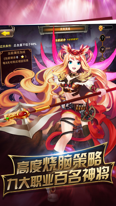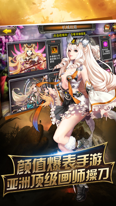 战姬物语-激斗无双 全新机甲战斗手游 开启女体混战时代!热血激燃战斗手游!《战姬物语》融合机甲元素,由《超级英雄》原班人马制作,打造从未有过的炫酷游戏体验! ====IMAX级完美视觉体验==== 《战姬物语》由亚洲顶级画师操刀,IMAX级动画全屏特效轰击给你最震撼的感官体验!五灵战姬、多重特效,全新三国混战局面因你改变!快带领你的队伍开启战姬招募吧! ====首创全天候国战系统==== 《战姬物语》首创全天候即时国战玩法,喜爱PVP的热血分子可以体验全天战无休止多方势力对决了!冲破无聊的1V1竞技场模式,开放式沙盒设定让你拥有最自由的战斗选择!带领战姬联盟抗敌、君临天下,中原大势尽在你的一念之间! ====超绚丽战姬合体技能==== 角色之间的命运与羁绊一旦开启,就将有无所不能的合击技能出现!强力阵容搭配,烧脑策略对决,激发战姬之间缘分,秒杀全屏不再是梦想! ====极致丰厚的公测福利==== 登录神将送不停、钻石摩天轮带来超给力福利!只要登录《战姬物语》,无需抱土豪大腿,超值1888元福利限时送达,平民也能逆袭!还有更多豪礼在游戏中等你哟!