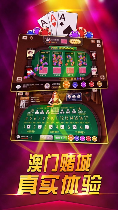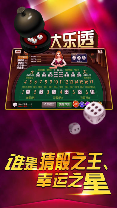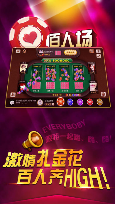 百人三张牌——最真实最刺激的网上电玩城,扎金花百人场,一起嗨起来。娱乐又可赚钱的游戏。最公平最不坑爹的概率游戏,一切都随机,无人为操控,纯运气、智慧和胆量的较量! 大乐透骰宝,谁是幸运骰神? 百人场,谁是永不言败的庄家?快来坐庄,快来破庄,看谁是真正的赢家! 爱梭哈的玩家敬请期待我们的标准场!