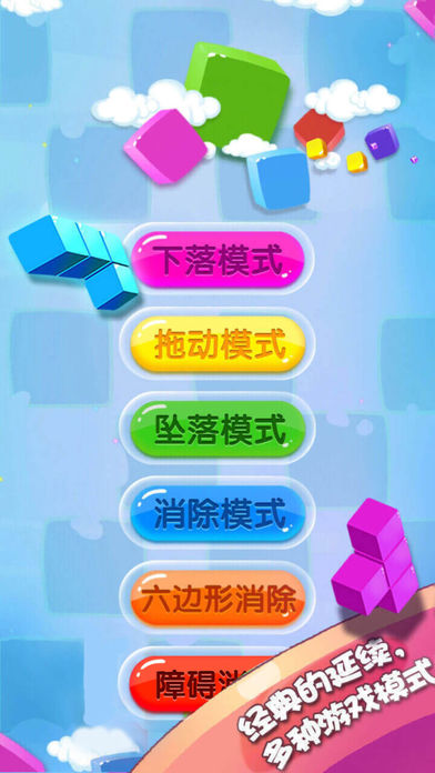 经典游戏无论在何时何地,它的地位一定是无可撼动的。如何让玩家不觉得腻味,那就必须得试试这款咯~ 方块游戏界的泰斗,消除世界里的大咖,你一定久闻他的大名,也一定唤醒了众多玩家的童年记忆,引发了许多共鸣…… 游戏现已涵盖多种模式: ·下落模式:经典玩法,使用宫格旁的键控制方块的下落,同时消除的行数越多,得分越高; ·拖动模式:将屏幕下方的三个备选方块拖入宫格中,一行或一列铺满即可消除,直至备选方块无法放置,则消除游戏结束; ·坠落模式:变异玩法,块块传奇升级版,使用宫格旁的键改变坠落方块的颜色,3个以上相同颜色的方块叠在一起即可消除,累计26行时消除游戏结束; ·消除模式:消除游戏的关卡挑战玩法,点击3个及以上相同颜色叠在一起的方块即可消除,达到目标分后跳转下一关,一起在方块世界里打造块块传奇吧; ·六边形消除:玩法较之经典数独游戏更自由,横、左斜、右斜都可消除得分,同样是备选方块无法放置时消除游戏结束; ·障碍消除:过关玩法,在剩余方块数用完之前消除所有捆绑的方块即可过关,使用1010方块宫格旁边的四个键控制俄罗斯方块的下落,四个相同颜色的方块叠在一起即可消除。 欢迎大家踊跃发出自己的分数来展示自己手指的灵活度哟~