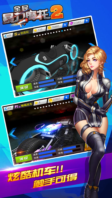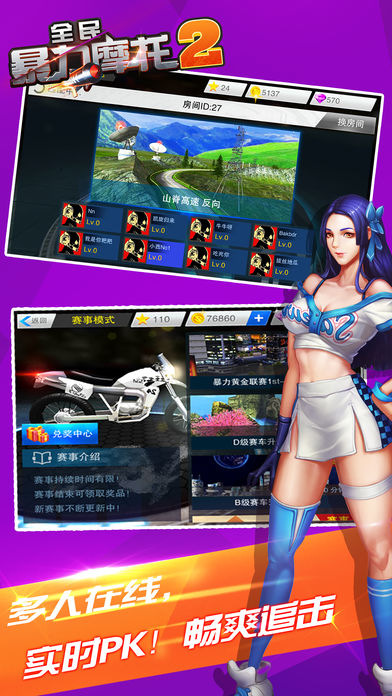 【暴力摩托】 正统手游续作!2016新版来袭!体验激情竞速的暴力美学! 【产品简介】 竞速与暴力核心玩法完美的结合,支持按键、重力两种模式的操作,超小的体积和炫酷的3D引擎,360度的3D真实名车体验,环游世界的生涯赛事!炫酷漂移,火爆PK,成为手机上的暴走族! 【游戏功能】 **畅爽打击** 真实的暴力打击感,在极速过程中KO对手,让你爆到爽!震撼的画质、刺激的物理效果、体验精彩的追逐和冲撞。各种炫酷武器让你感受全方位的暴力摩托赛事! **联网竞技** 与世界各地的玩家实时PK,在移动设备上挑战真实的玩家。 **赛事活动** 每周都有全新的赛事活动推出,完成赛事挑战,获得名次即可领取丰厚的奖励! **生涯挑战** 华丽逼真的赛道及精心设计的关卡,让标准、挑战、生存等赛车经典玩法模式再次提升。完成生涯赛事的闯关挑战,环游世界,书写属于自己的传奇!