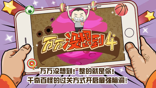 万万没想到4!最囧智力游戏强势来袭! 一次玩尽兴,疯狂还给我! 这是一款遵循逆向思维的小天才养成游戏,让你打破常规思维意识的束缚。 它创意荟萃,千金不兑,独具匠心,惊险刺激,趣味连篇,打破常规,让人上瘾! 这是一款带你走进知识智慧的殿堂、发挥你脑力思维之最右脑潜能开发,这将让你深深爱上万万没想到4”! 《万万没想到4》评测 《万万没想到4》看名字是不是真的很有趣,而这款游戏嘛...一向以秀外慧中自诩的小编只好呵呵了。虽然现在还在坚强地为大家介绍着这款游戏,不过一会会发生什么血腥场面可就难以预计了。如果突然做出什么发疯、摔机之类的举动,请大家予以谅解,人家毕竟是个妹子,人家心理真的承受不了了。 游戏内容:认真你就输了 好吧,可能一些小朋友还摸不到头脑,究竟是怎样的深仇大恨让小编一上来就一通炮轰不能自拔。带你走进脑力达人的魔法学院。此类益智游戏向来不按常理出牌,内容更是千奇百怪,需要你学而思,勤于思考。真是让宝宝培养最强大脑的家庭教师。总体来说就是:认真你就输了。不过奇怪的是,似乎大家都非常享受这种被虐的快感。一边怒骂其丧心病狂,一边还笑得跟要撒手人寰似的。啧啧,你们人类真奇怪,我要和教授回星星去了。 简易画面:你画画真有才 游戏在画面上倒是没有继续沿用敷衍感满满的铅笔画风格,在某些关卡好歹用心的涂上了一些亮丽的颜色,这是要让你成为速算大师的节奏。不知其低俗内涵的可怜人们,可能还会被第一关那喜庆的大红色欺骗,以为他们良心发现,会正常出击来着。不过这个留着汉奸头的男人是来干嘛的?两个鼻孔是在模仿泷泽萝拉嘛?穿着更是从头至尾都没有变过,永远是一件跨栏背心配上宽松的大裤衩。啊喂,人家好歹是主角啊,走点心好不啦。 坑爹玩法:万万没想到4 还能这么玩 要说这款休闲游戏如何玩,还真没有办法给一个定论,每个关卡玩法都各不相同,所应用的思维导图也各不相同。每过一关,小编的心跳都会停止跳动一下,从最初的满脸呆滞不可置信,渐渐竟然变成了会嘴歪眼斜地跟着哼唱一句“万万没想到,啦啦啦啦啦...” 坑爹关卡:关不在多 有坑则灵 让宝宝知道这个游戏共分为24个关卡,不要嫌弃它的关卡太少,这可是为你考虑呢。玩的太多了,小心走火入魔,心理变态哦。成为小天才脑力达人才是关键哦。不过在游戏的后期。需要打开速算的能力盒子才有机会过关。听到停课铃响起,谁给你的勇气!你以为出几个丧心病狂的题目就能吓到我们,我们就会乖乖听话了嘛?好吧,小编先去评分,我们回来再战! 小编总评:节操已粉碎性骨折 斗志依然不减 当那挂着小天才脑力达人养成、考验速算思维导图的关卡不断推陈出新,小编就彻底疯了。身为一位家庭教师的角色,游戏这么难,你妈妈知道嘛?仅仅号称男人会流泪女人会心碎简直是太谦虚了啊,小编该碎不该碎的地方都已经成渣渣了啊。可是就算已经被碾成粉末,脆弱小编那双颤抖的手依然无法离开屏幕。拼了,我跟你拼了.... *** 网友评测 *** 《万万没想到4》评测:有创意够欠扁 同类型或者名字相似的游戏总会扎堆出现,经常关注iOS排行榜的玩家可能对此想象早有耳闻。中国区则有一款最囧智力游戏逆历史潮流,这款游戏就是《万万没想到4》。《万万没想到4》玩家对于游戏的风评似乎不错,纷纷评价其“够创意,够有趣,够欠扁,让你学而思的游戏!让你哭笑不得,却又让你充满智慧!”。那么今天就让小编和各位玩家一起体验这款欠扁的游戏吧! 休闲益智,这四个字就是小编给这款游戏界面的最强评价。部分玩家可能会持相反的意见,并声称“这就是这个游戏的风格啊!”。游戏的风格是个很深奥的命题,但他绝不是像《万万没想到4》那样制作如此简陋粗糙,许多游戏也是走简约路线,例如前几年爆红的《蜡笔物理学》。《蜡笔物理学》的画面都是用蜡笔手绘而成,主体风格更像是用小孩子的视角描绘了一个新的蜡笔世界,这才叫游戏的风格。《万万没想到4》充其量只是将收集到的素材用恶俗的方法展示出来罢了