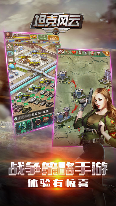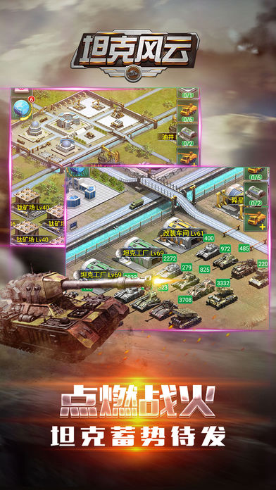 《坦克风云:战地坦克》是一款由雷尚(北京)科技开发的全球首款坦克题材SLG手游; 《坦克风云:战地坦克》中收录了古今中外各种主战坦克,千万部队汇聚一格。不光逼真的还原了战车外形,更通过极致的特效,生动的演绎出各国钢铁雄狮在战场上激烈战斗的精彩画面,各种细节都十分到位,让你身临其境。 【重装出击 谁与争锋】 手机大作《坦克风云:战地坦克》,让玩家能重温经典策略游戏的经典。游戏无论从战斗,采集,布阵等方面操作感和代入感都极强。 【陆战之师,装甲雄风】 丛林战,闪电战,平原战,沼泽战等多种知名的战术在游戏中均有所体现,让您在《坦克风云:战地坦克》中体验独一无二的战斗风格,带来非凡的战斗体验。 【万人跨服 铁血争霸】 《坦克风云:战地坦克》是一款非常激烈的军事策略游戏,玩家将进入到坦克大战的世界之中,在这里建设自己的基地,然后同敌人来一场轰轰烈烈的对战。游戏为玩家们带来了非常多类型的坦克,玩家可通过军团战、个人战、世界争霸、跨服战等和玩家对战,你要战,那便战! 游戏特点:轻松易懂的操作流程,精雕细琢的画面风格,带给您超逼真的游戏体验风格。《坦克风云:战地坦克》除了及其逼真的画面以外,对细节上的处理也独具创新。生气勃勃的基地,烟硝弥漫的战场,坦克射击后弹出的蛋壳和散去的硝烟。战斗中可能发生的情况都会有非常精彩的体现。