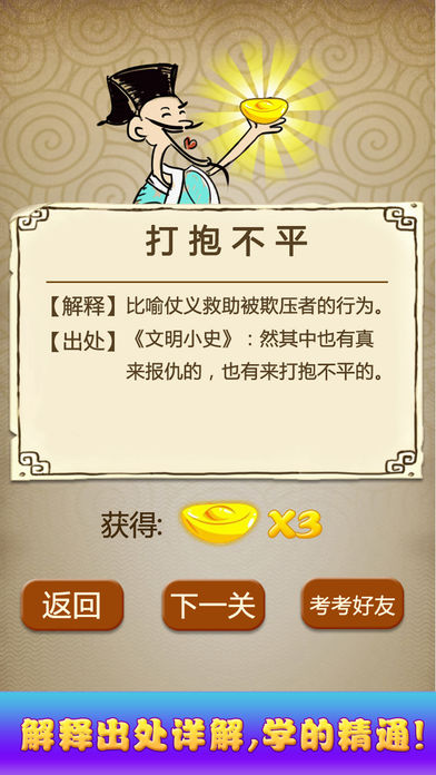 这是一款益智休闲成语学习应用,通过看图猜成语来学习成语,寓教于乐,开心学习成语解释、了解成语典故和出处,让学习成语从此不再枯燥。 猜成语汇集了上千个经典的成语,让你在汉字王国的海洋里尽情享受中国博大精深文化的熏陶,做一个真正的中华学霸。 您可以通过微信微博求助和挑战你的朋友们,看看谁是成语脑力达人。