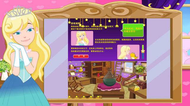 公主配唇彩吻青蛙第二部~~童话中,公主为了救她的青蛙王子,配了魔法药唇彩,然后去亲青蛙,就可以让青蛙变回王子...可是,魔法唇彩要怎么配呢?寻找完美的配方制成完美的唇彩得到最完美的王子!发挥你的魔力吧,配制出独一无二的魔力唇彩,变幻出你最钟爱的青蛙王子! 操作方法: 手指操作,选四种不同的配料放入瓶子中制作唇彩,涂抹唇彩时需要快速地左右移动手指,亲吻怪物前需要用手指连续点击怪物。亲吻后,就知道你所配置的唇彩能不能将怪物变成王子了!