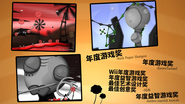 “年度iPad游戏” - TouchArcade “年度iPad游戏” - MetaCritic 粘粘世界里美丽、惊人、数以万计的粘粘球们正好奇地探索着——但是他们不知道它们正在一个游戏里,好玩又美味。 这是一个几乎获得了所有奖项的游戏,现在你可以使用iPhone和iPod Touch玩这个游戏了!只需拖动活着的、爬行着的、聊着天的粘粘球,就可以搭出你自己的塔、桥、炮弹、飞船,还有巨大的舌头! 神秘的关卡 - 每一关都很奇特,如玫瑰般危险又美丽,还有新的历险,新的风景,生活在那里的生物们。 粘粘球 - 在历险途中,拥有奇异功能的新种粘粘球来到一起,向你展示探索、爱情、策略、美人、电力与…