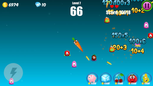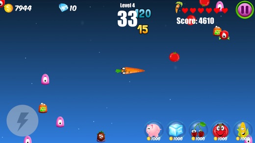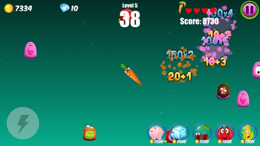 玩法简介 玩家需要射击出现的害虫来保卫胡萝卜不受侵害。 害虫会在不同方向随机出现。 远程击中害虫有额外的积分和金币奖励。 发射的炮弹连续击中害虫有额外的积分和金币奖励。 激动人心的高分排行榜。 游戏中会随机出现道具,击中道具有相应辅助效果: 1、害虫的尺寸变大,更容易被击中。 2、害虫被冻结8秒,不能行动。 3、一次射击发射出3发炮弹,形成弹幕。 4、射出的炮弹变成番茄,尺寸变大,伤害加倍。 5、射出的炮弹变成玉米,可以穿透多个害虫。 也可在游戏内点击道具按钮获得相应效果,消耗金币或钻石。