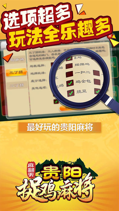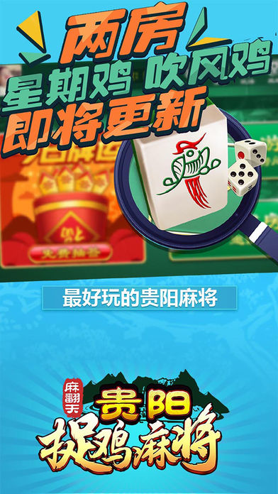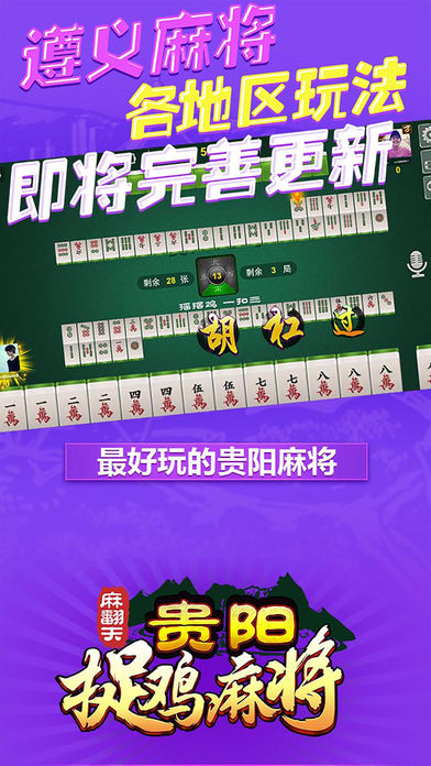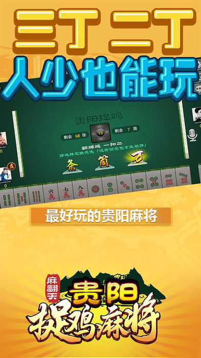 传统的贵阳麻将玩法,非常好玩 特性: 1.贵阳捉鸡玩法,三丁拐,二丁拐,支持一摸二,一摸三,连庄模式,支持摇摆鸡 2.私密桌子,可以建立游戏房间邀请任何你想邀请玩家进入游戏 3.战绩复盘,可以播放你玩过的任何一局,杜绝作弊让麻将更纯粹 4.语音聊天,游戏更畅快 5.更稳定的网络连接,更炫酷的特效,更优雅的细节 遵义麻将,安顺麻将,铜仁麻将,各种麻将敬请期待,持续更新开放中