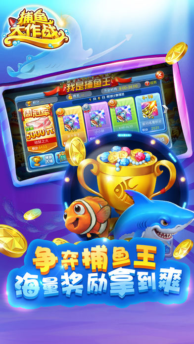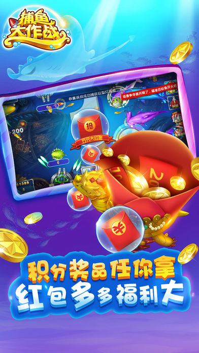 捕鱼大作战是一款多人联网实时对战的休闲类手机游戏,强调极易上手与欢乐流畅的游戏体验,通过梦幻深邃的海底场景、自然精致的鱼群刻画、华丽爽快的捕鱼画面、创意无限的玩法设计、诚意十足的各项活动,使玩家仿佛置身童年幻想中的游乐场中尽情娱乐。 【游戏特色】 1.3D画面,海底探险身临其境 2.经典捕鱼,千炮金币爆不停 3.深海争霸,实力较量赢大奖 4.好友共聚,高额红包齐分享 5.百万惊喜,海量金币免费领 超嗨超刺激,快来一起领略真正的海底世界吧!