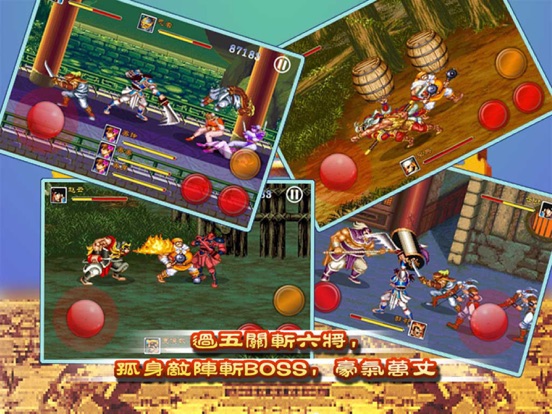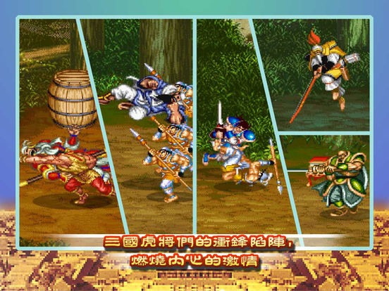 -------人物------- 关羽:步行时没有拿兵器,以徒手战斗,绝技为猛虎扑。 张飞:步行时没有拿兵器,以徒手战斗,绝技为暴裂拳。 赵云:步行时执剑,动作最敏捷,绝技为升龙斩。 黄忠:步行时执弓箭,为唯一能远距离攻击的角色,但不适合近战,绝技为冲天弓。 魏延:步行时执长刀,绝技为旋风腿。 -------关卡------- 博望坡之战上:敌方大将为李典,执长枪,能飞踢。 博望坡之战下:敌方大将为夏侯惇,以炸弹攻击,还会喷火与飞天重压。 新野城:敌方大将为许褚,执大铁槌。会车轮冲撞及飞天重压。 赤壁之战:敌方美美、美冴、美铃三个女将 白河:敌方大将为曹仁,执长剑及大型流星锤。 长坂坡之战:敌方大将为淳于导。执长柄双月刀。 长坂桥:敌方大将为晏明与副将夏侯杰。晏明执长柄大刀,夏侯杰执长枪。晏明的攻击能发出冲击波,而且还会车轮冲撞