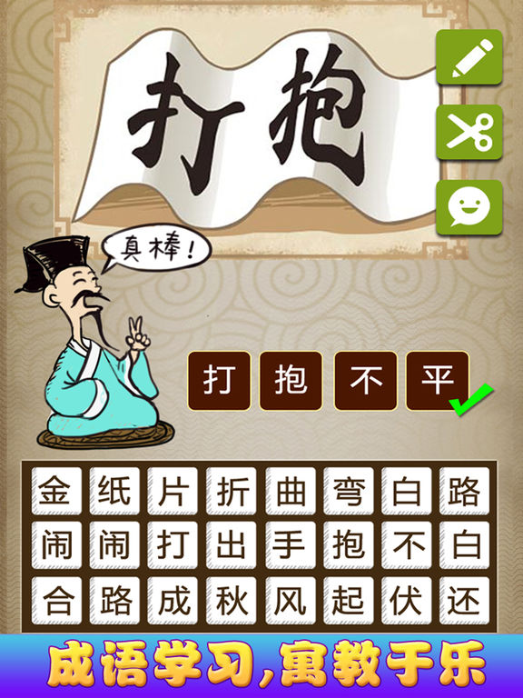 这是一款益智休闲成语学习应用,通过看图猜成语来学习成语,寓教于乐,开心学习成语解释、了解成语典故和出处,让学习成语从此不再枯燥。 猜成语汇集了上千个经典的成语,让你在汉字王国的海洋里尽情享受中国博大精深文化的熏陶,做一个真正的中华学霸。 您可以通过微信微博求助和挑战你的朋友们,看看谁是成语脑力达人。 游戏特色: 1、上千个成语关卡,寓教于乐,学习不再枯燥 2、支持分享,小伙伴们一起来学习