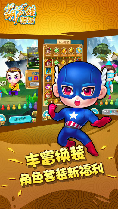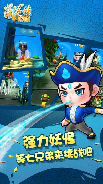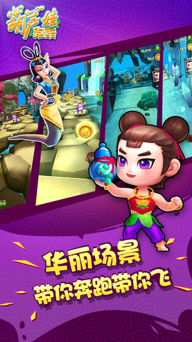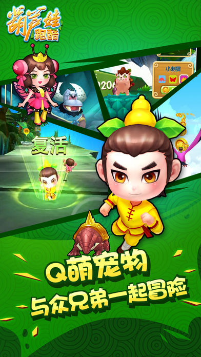 游戏简介: 重温儿时经典,上海美术电影正版授权《葫芦娃跑酷》跑酷游戏震撼来袭! 游戏特点 【经典重现】 还原葫芦娃兄弟故事的经典元素,是一款充满童年记忆的手游! 【实力开战】 葫芦娃与蛇精蝎子精的斗智斗勇,带上小蝴蝶一起披荆斩棘! 【欢乐酷跑】 极简的操作按钮,奔跑中灵活跳跃下滑,掌握整个酷跑世界! 【变化多样】 多种趣味套装,多种培养途径,多种法宝道具,给你每天不一样的葫芦娃! 葫芦兄弟等你开跑!感受指尖带来的快感!