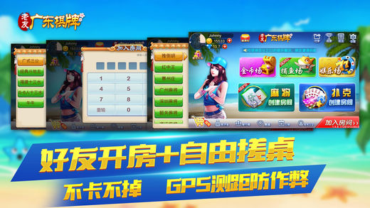 【游戏介绍】 1、开房游戏 麻将:推倒胡、红中王、惠州庄、广州麻将、深圳麻将、韶关麻将、湛江麻将和鸡平胡; 扑克:三公、斗地主、十三水、5-6人十三水、拼十牛牛和跑得快; 2、金币游戏:推倒胡、二人麻将、红中王、斗地主和海王捕鱼 3、特色的粤语音效,实时语音聊天,GPS地图实时测距防作弊!