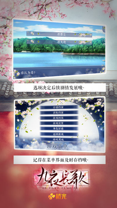 【游戏简介】 一朝穿越 并非偶然,皆是命定。 一场命定的相遇,而与她相似几分的容颜。给你带来的究竟是福是祸? 而你又该如何解开心结呢? 作为眼线的你入宫选秀,又该作何选择? 而在此期间你遇到形色各异的男主 你该如何选择呢? 【游戏元素】 古风,宫廷,穿越,虐心,二次元,橙光,言情,文字,游戏 游戏字数:152980字 ———— 制作工具:橙光文字游戏制作工具 授权发行:橙光游戏中心 作者:萌萌萌惠 客服QQ:800066931 玩家评论: 很喜欢,其实每个男主都有个性。我都喜欢。怎么办啊,我感觉自己好博爱啊啊啊啊啊啊 我很喜欢九夜的口是心非,看着冷冷的实则是一个内心温柔的男人,总爱捉弄歌儿,玩的BE结局特别是歌儿死后,九夜带着歌儿的尸首,对歌儿吐诉情义时,让我很心疼九夜,把我哭惨了::: 我很喜欢墨尘,他失去柔儿时,让我明白了他是一个十分痴情之人,当第一次遇到歌儿时,他是厌恶的。一步一步与歌儿的接触,让他渐渐地对歌儿产生了浓厚的兴趣,想揭开歌儿的真面目。但在了解歌儿时,慢慢被歌儿天真可爱,勇敢善良所吸引,慢慢的自己的心被她所占满。 其实游戏的故事情节真的很丰富饱满,人物立绘也是风华绝代,让人恋上了一个个的帅哥美男啊。 游戏中有很多的唯美情节,有画面感人的,有虐人心弦的,真是一部经典古风。 相信很多玩过的的玩家一定跟我有同感吧! 期待左线的后续更新。 ---玩家ID:瑾恋~ 细雨如烟,萧瑟漫无边,残阳夕照,水面漾波链。相知,缘何离别伤,暮然回首,为君顾倾颜。长歌穿越后遇到的第一个男人--君九夜,开始时我对这个自以为是的人有些厌恶,随着剧情的发展,渐渐走入他的内心。其实他并不是一个无情的人把?长歌的活泼,热情渐渐地温暖了他,让长歌进宫时,他也是很纠结的吧?君九夜对长歌的爱很霸道,但越是这样,说明他越害怕失去长歌。君九夜,皇位和美人,你 会选哪一个?愿卿此别相离后,更莫相赠生冤仇。 游戏做的真的很用心,画面很唯美清新,封面上的动态雨更增添了丝凄凉色彩,在作者的笔下人物形象很生动,很形象,同时也把剧情的悲伤表现得淋漓尽致,完了三遍哭了三遍【作者大大你陪我三盒纸】 ---玩家ID:最熟悉的陌生人