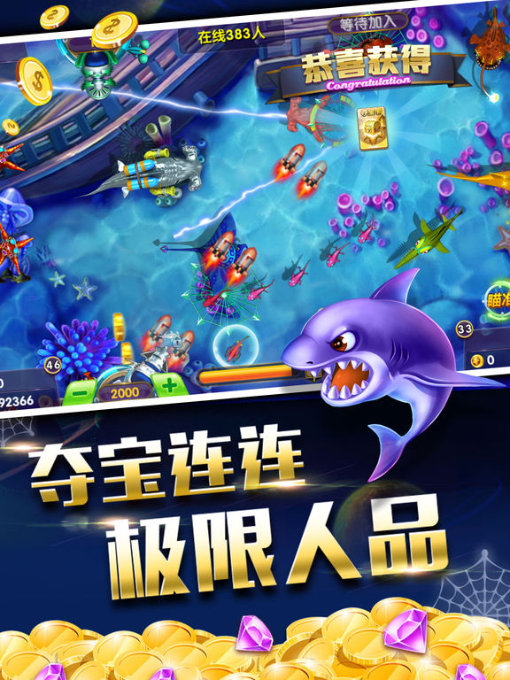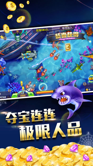 游戏简介: 全新一代联网对战捕鱼游戏,现金夺宝震撼升级!万人渔场,爽快捕杀,现金回报,疯狂夺宝!3D海景华丽酷炫,百种鱼类任你捕杀,超高爆率全屏掉宝,现金实物轻松赢取,越玩越爽,越玩越赚!每天海量金币领取,让你无忧捕鱼,轻松畅玩。 游戏特色: 1,多种途径获取夺宝卡,实时兑换现金实物大奖。手机话费、京东购物卡、iphone7、ipad mini4等数十款超豪华奖品阵容,在线兑换,快递到家。奖品无上限,人人有机会! 2,金蟾捕鱼、大圣捕鱼、李逵捕鱼等逼真3D海底场景,百种大小鱼类,爽快街机玩法,炮塔自动射击,BOSS精准锁定,捕杀快感,一网打尽! 3,闪电炮、末影忍者炮、魔能机甲炮、毒蜂王、冲能炮等数十款特色炮塔,强大技能极限轰杀,百万金币唾手可得。 4,联网对战,在线PK,万炮狂轰赢取百万金币和夺宝卡,夺宝卡直接兑换现金实物,实力就是财富! 【联系我们】 客服QQ:1726572558