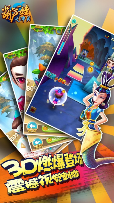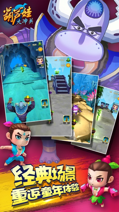 《葫芦娃大冲关》是一款炫酷3D动作跑酷手游。游戏剧情紧扣原版动画,作为国民级动漫经典的诚意之作,再现70-80-90后美好回忆。 《葫芦娃大冲关》高端品质打造,诚意之作,承续经典! 【游戏特点】 1. 丰富的3D人物造型 国民漫画经典与3D特效相结合 七个活灵活现又呆萌无限的葫芦兄弟,升华玩家童年美好回忆。高清的3D电影级画面,华丽的画面效果,绚丽的特效搭配上七个葫芦娃的特色技能,享受真的3D狂奔冒险。 2. 绚丽的场景元素 惊心动魄的冒险之旅 为救爷爷,葫芦七兄弟穿越层层阻碍,势与蛇精一绝高下。游戏中不但拥有阴森恐怖的山洞地图,还有绚丽的水面荷塘,嶙峋的山峰,袅袅的祥云,让玩家身临其境!葫芦娃的营救冒险之旅一路崎岖且惊心,奋战蛇精,抵挡蛤蟆怪,老鼠妖的拦路突袭,一路精彩无限。 3.丰富的任务系统 完整的玩法体系 游戏中不但拥有完整的剧情引导主线任务,还有丰富的在线日常活动。在线排名系统,每日领取任务,葫芦娃技能提升….极大提高了玩家的操作能力和游戏的趣味性,更大程度啥吸引玩家持续游戏。 动动手指!GO!!!