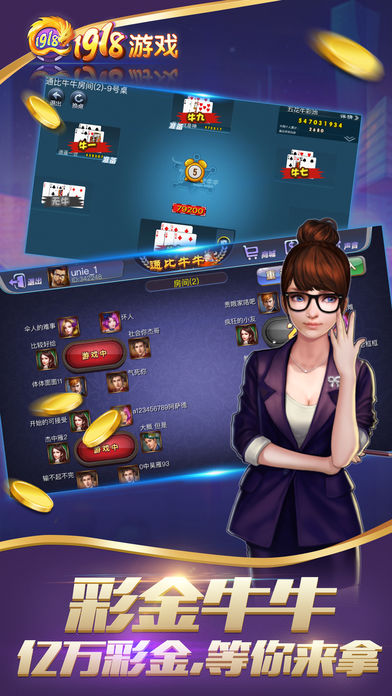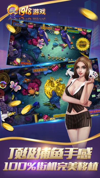 1918棋牌:2017最新的手机棋牌游戏,内含牛牛,捕鱼,水浒传,连环夺宝,百家乐等等,各种街机游戏应有尽有。全新玩法带给你不一样的游戏体验,各种游戏彩金中不停,让你嗨翻天。 游戏特点: 1,公平公正,全真人在线竞技,拒绝作弊,让你轻松体验到最真实,最刺激的手机游戏乐趣。 2,界面精美,专业美工团队打造,绝对惊爆你的眼球。流畅的动画效果,轻松的优美的音乐,让您更加放松愉悦的进行游戏。 立即点击下载,加入我们,体验最精彩的2017棋牌游戏。