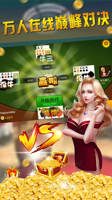 老子不斗地主,老子不打麻将,老子要斗牛牛!《91y快乐斗牛》酷炫来袭!游戏操作简单,男女老少皆宜。多种策略玩法,享受最牛、最疯狂、最刺激的棋牌对战! 【玩法】 玩家发到的五张牌分两组,第一组3张牌和第二组2张牌之和分别是10的整数倍就是牛牛(只第一组是10的倍数则有牛)! **在牛牛的的世界里,博的不仅是运气,还要分析数据,选择对策,击败庄家,才能常胜!**
