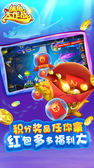 捕鱼大作战是一款多人联网实时对战的休闲类手机游戏,强调极易上手与欢乐流畅的游戏体验,通过梦幻深邃的海底场景、自然精致的鱼群刻画、华丽爽快的捕鱼画面、创意无限的玩法设计、诚意十足的各项活动,使玩家仿佛置身童年幻想中的游乐场中尽情娱乐 【游戏特色】 1.3D画面,海底探险身临其境 2.经典捕鱼,千炮金币爆不停 3.深海争霸,实力较量赢大奖 4.好友共聚,高额红包齐分享 5.百万惊喜,海量金币免费领 超嗨超刺激,快来一起领略真正的海底世界吧!