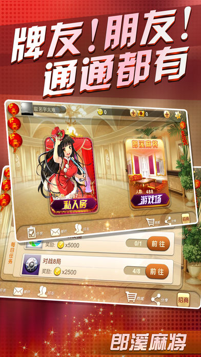 郎溪麻将,专为郎溪人定制的手机麻将游戏。采用郎溪当地流行玩法为规则的游戏,游戏中带有自建房功能。