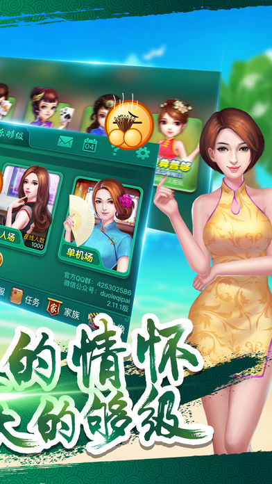————多乐够级 山东经典免费 扑克游戏——— 风靡山东的特色经典游戏——多乐够级,融合青岛够级、济南够级、烟台够级、威海够级、枣庄够级、临沂够级、泰安够级等地玩法规则,匠心之作,打造经典的手机够级游戏,囊括开点发四、大王2杀1,经典普够等经典玩法,同时还分进贡、非进贡场次,包含单机版、联网版。免费下载、无需注册,每天数十万玩家在线,用手机即可立即与万千同城牌友欢乐够级。 ————多乐够级 游戏特色———— 【玩法丰富】不仅包含开点发4、大王2杀1玩法,同时各玩法还分别有进贡、非进贡场次,多种够级游戏玩法任君选择。 【操作简单】四副牌多?多乐够级游戏采用智能选牌,一指选牌,简单便捷,玩够级就是这么轻松。 【免费领豆】多乐够级中每日可通过多种途径领取游戏豆,签到、分享、任务让你豆豆拿不停。 【激情竞技】3v3团队竞技,联邦间的巅峰对决,严格作弊查处机制给您公平竞技环境。 【配桌机制】多乐够级游戏开始前可以查看玩家等级水平,再也不用怕被队友坑了,输赢完全靠水平和配合。 【 丰厚奖励】多乐够级会经常性举办比赛,只要你够强,丰厚奖品拿到手软。 【互动娱乐】私人场一键喊话邀请好友一起手机够级其乐无穷,互动表情、山东方言调侃队友嗨到爆! 【同城游戏】万千山东老乡共同选择,同城约局神器,多乐够级,让游戏也成为您的社交方式! 山东地区棋牌种类丰富,保皇够级风靡鲁地,多乐深耕济南棋牌、潍坊棋牌、聊城棋牌等多地棋牌游戏,全力打造原汁原味山东特殊经典够级游戏,画面媲美QQ、JJ、波克、博雅、腾讯、同城游够级等牌类游戏,游戏玩法赶超QQ够级、腾讯够级、大眼够级、联众等够级游戏,堪称移动端够级游戏的经典力作。 ————多乐够级 无处不在 每时每刻 传播快乐———— 多乐够级是由多乐团队重磅推出的一款针对山东地区休闲游戏中极具竞技性的牌类游戏。再续保皇经典,游戏画面精美,内容丰富,因此受到众多玩家的欢迎,每天在线人数十余万,单机、联网场让你有无网络,都可随时随机都自由打够级。 ————多乐够级 联系方式———— 官方QQ群:多乐够级官方群 (425302586) 官方微信公众号:duoleqipai 新浪微博:@多乐保皇够级